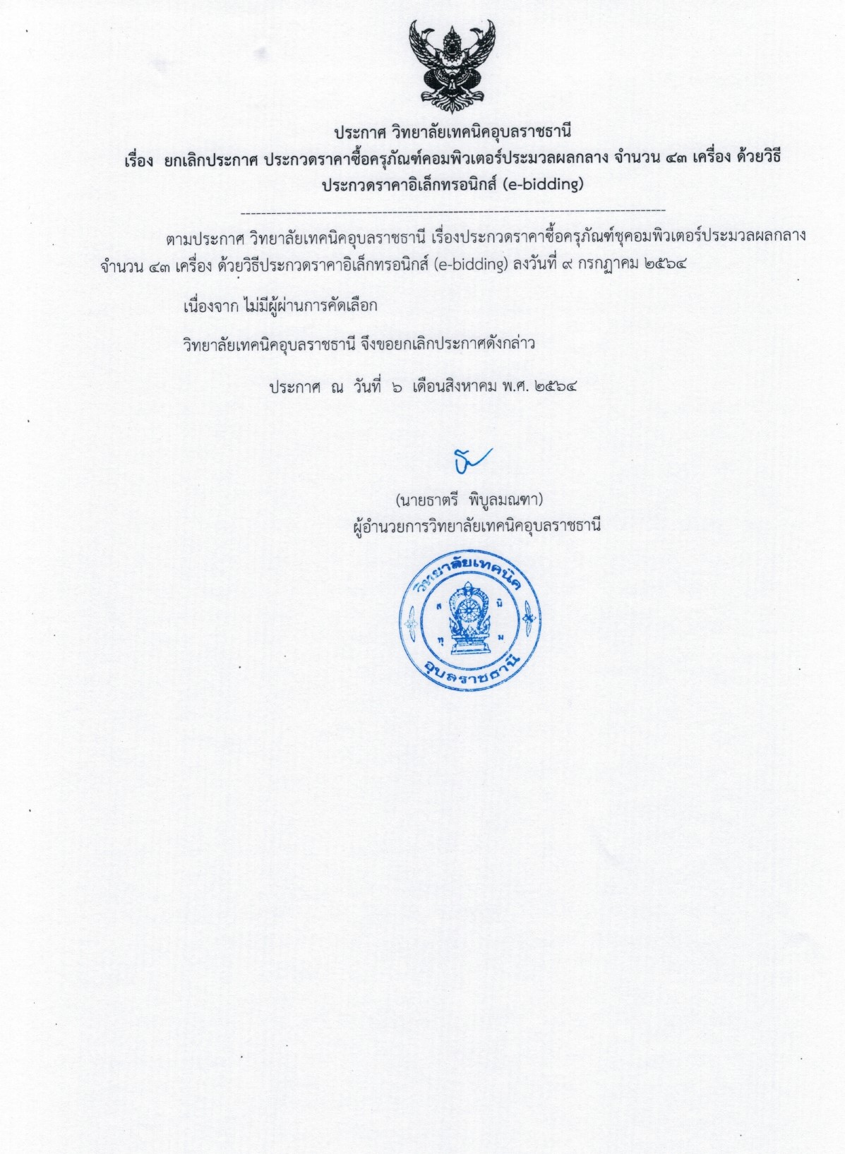 ยกเลิกประกาศ ประกวดราคาซื้อครุภัณฑ์คอมพิวเตอร์ประมวลผลกลาง จำนวน ๔๓ เครื่อง ด้วยวิธี ประกวดราคาอิเล็กทรอนิกส์ (e-bidding)