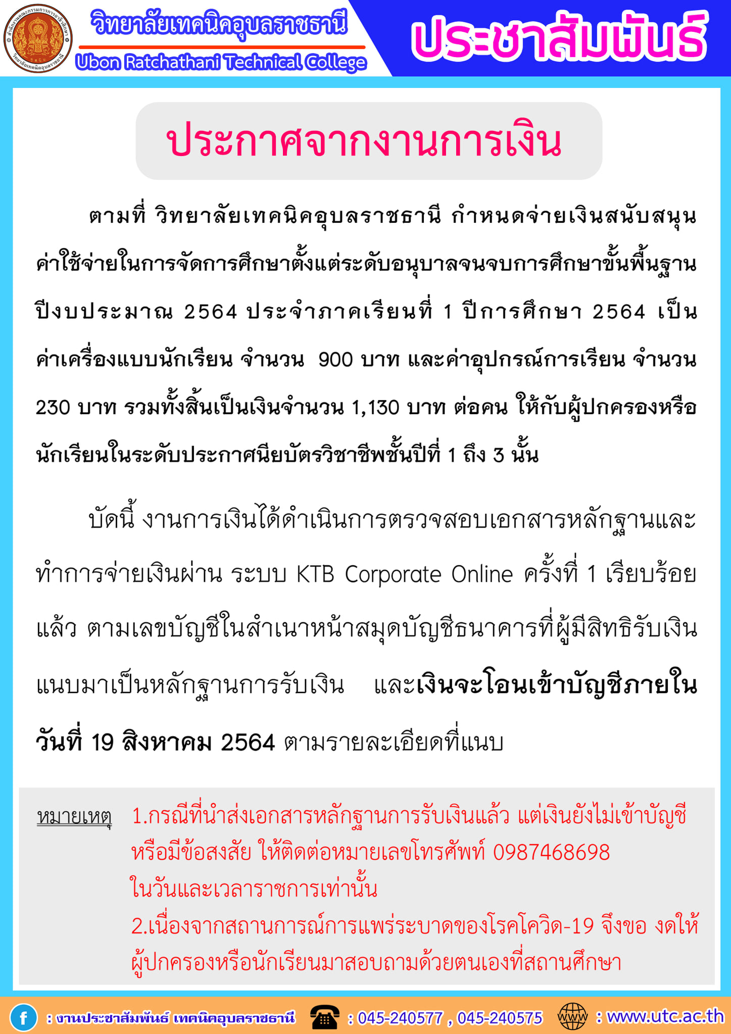 ประกาศจากงานการเงิน เรื่อง รับเงินเรียนฟรี