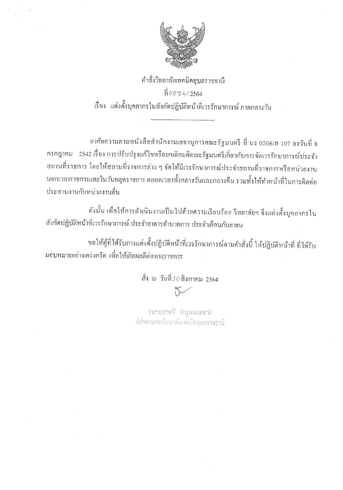 แต่งตั้งบุคคลากรในสังกัดปฏิบัติหน้าที่เวรรักษาการณ์ ภาคกลางวัน ประจำเดือนกันยายน 2564