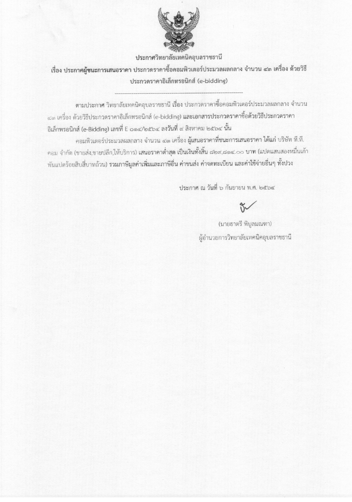ประกาศผู้ชนะการเสนอราคา ประกวดราคาซื้อคอมพิวเตอร์ประมวลผลกลาง จำนวน ๔๓ เครื่อง ด้วยวิธีประกวดราคาอิเล็กทรอนิกส์ (e-bidding)