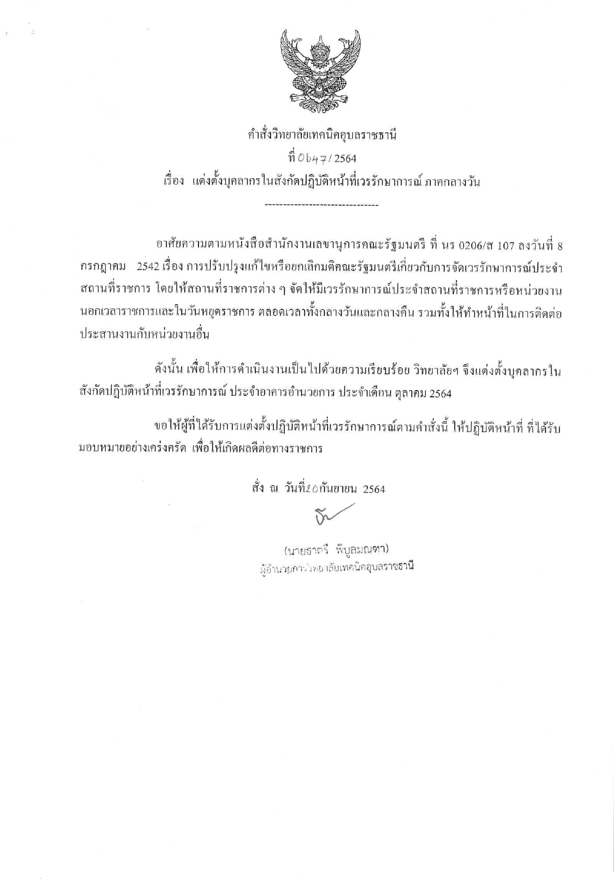 แต่งตั้งบุคคลากรในสังกัดปฏิบัติหน้าที่เวรรักษาการณ์ ภาคกลางวัน ประจำเดือนตุลาคม 2564