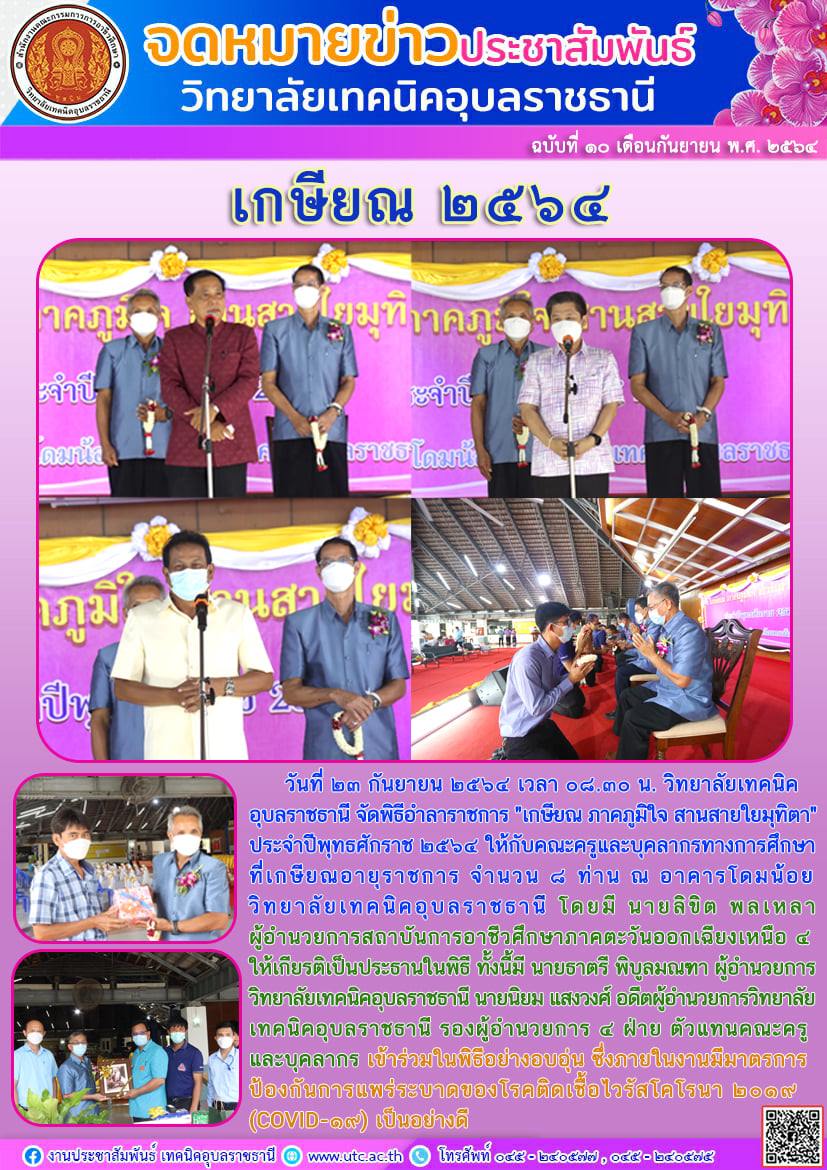 วันที่ ๒๓ กันยายน๒๕๖๔ เวลา ๐๘.๓๐ น. วิทยาลัยเทคนิคอุบลราชธานี จัดพิธีอำลาราชการ “เกษียณ ภาคภูมิใจ สานสายใยมุทิตา” ประจำปีพุทธศักราช ๒๕๖๔ ให้กับคณะครู และบุคลากรทางการศึกษา ที่เกษียณอายุราชการ จำนวน ๘ ท่าน ณ อาคารโดมน้อย วิทยาลัยเทคนิคอุบลราชธานี โดยมี นายลิขิต พลเหลา ผู้อำนวยการสถาบันการอาชีวศึกษาภาคตะวันออกเฉียงเหนือ ๔ ให้เกียรติเป็นประธานในพิธี ทั้งนี้มี นายธาตรี พิบูลมณฑา ผู้อำนวยการวิทยาลัยเทคนิคอุบลราชธานี นายนิยม แสงวงศ์ อดีตผู้อำนวยการวิทยาลัยเทคนิคอุบลราชธานี รองผู้อำนวยการ ๔ ฝ่าย ตัวแทนคณะครู และบุคลากร เข้าร่วมในพิธีอย่างอบอุ่น ซึ่งภายในงานมีมาตรการป้องกันการแพร่ระบาดของโรคติดเชื้อไวรัสโคโรนา ๒๐๑๙ (COVID-๑๙) เป็นอย่างดี