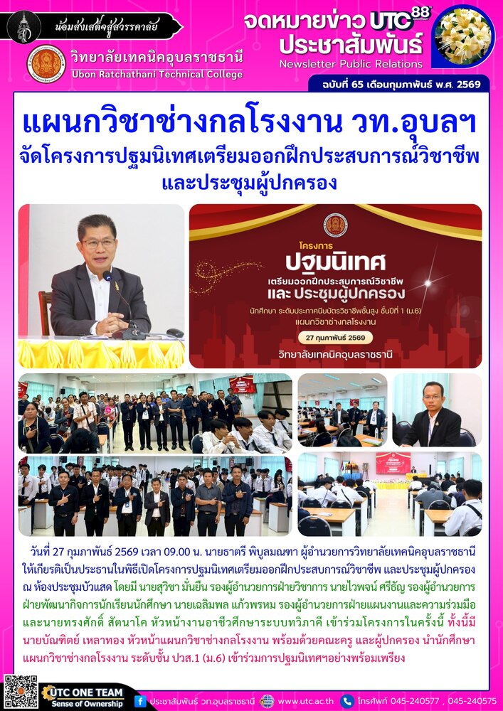 วันที่ 27 กุมภาพันธ์ 2569 เวลา 09.30 น. นายธาตรี พิบูลมณฑา ผู้อำนวยการวิทยาลัยเทคนิคอุบลราชธานี (เพิ่มเติม…)