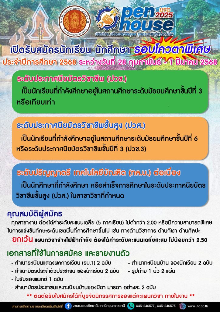 ขอเชิญร่วมนิทรรศการ “เปิดเรือน เยือนเทคนิคอุบล จุดประกายสู่สายอาชีพ (Open House)” ประจำปีการศึกษา 2568