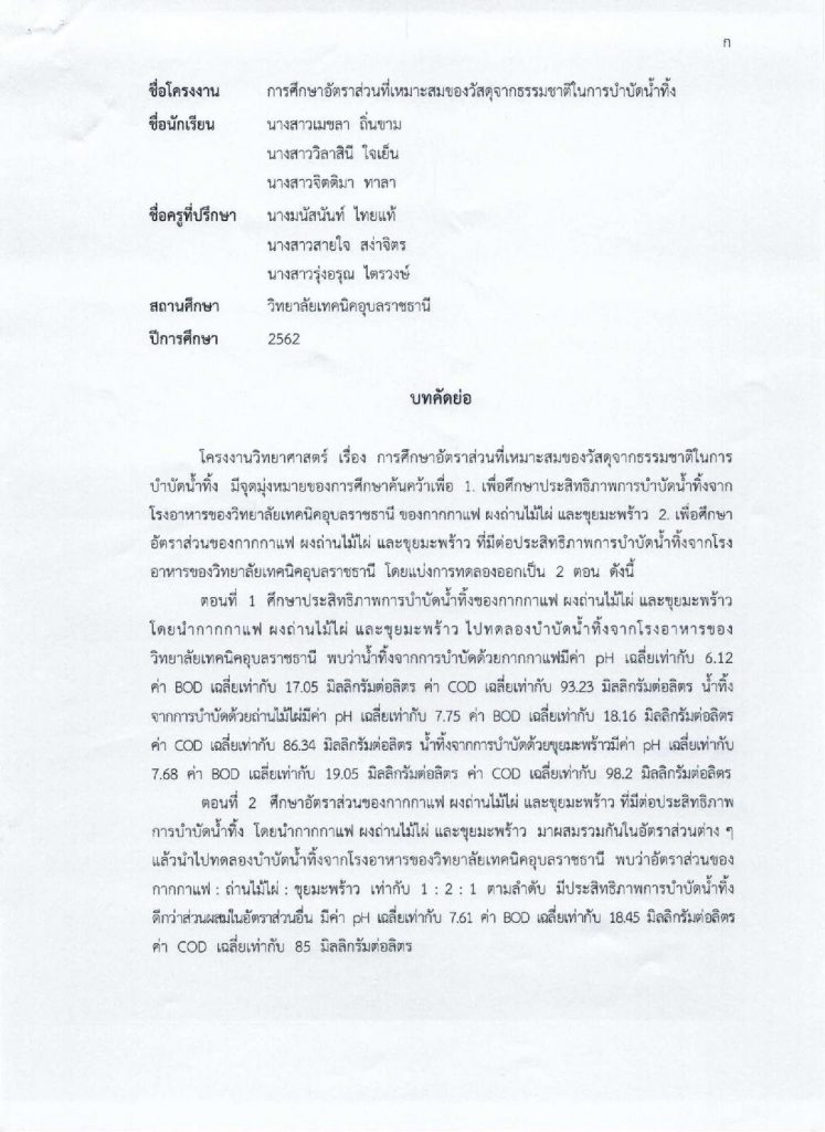 เรื่อง การศึกษาอัตราส่วนที่เหมาะสมของวัสดุจากธรรมชาติในการบำบัดน้ำทิ้ง